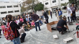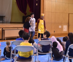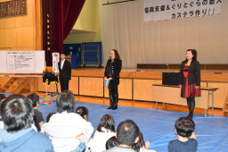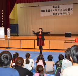 | 巨大カステラの前で大型絵本の読み聞かせです カステラつくりは、被災地支援活動をしている団体 ”非営利団体ふらいパンダ”さんの指導‼  |