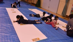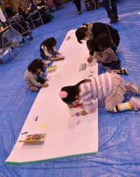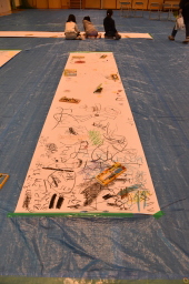 | みんなで靴を脱いで、ロールペーパーの周りに集まって、思い思いの絵をかき放題 | |