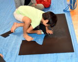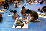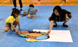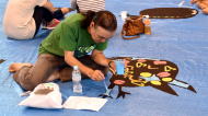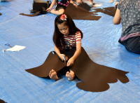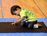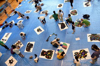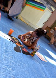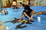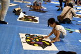 出来上がった絵は白い紙に張り付けて、会場に並べていきます。