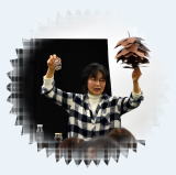ねこが魚の顔にはめ込まれて姿を変えると、愛嬌のある姿に笑い声が響きます